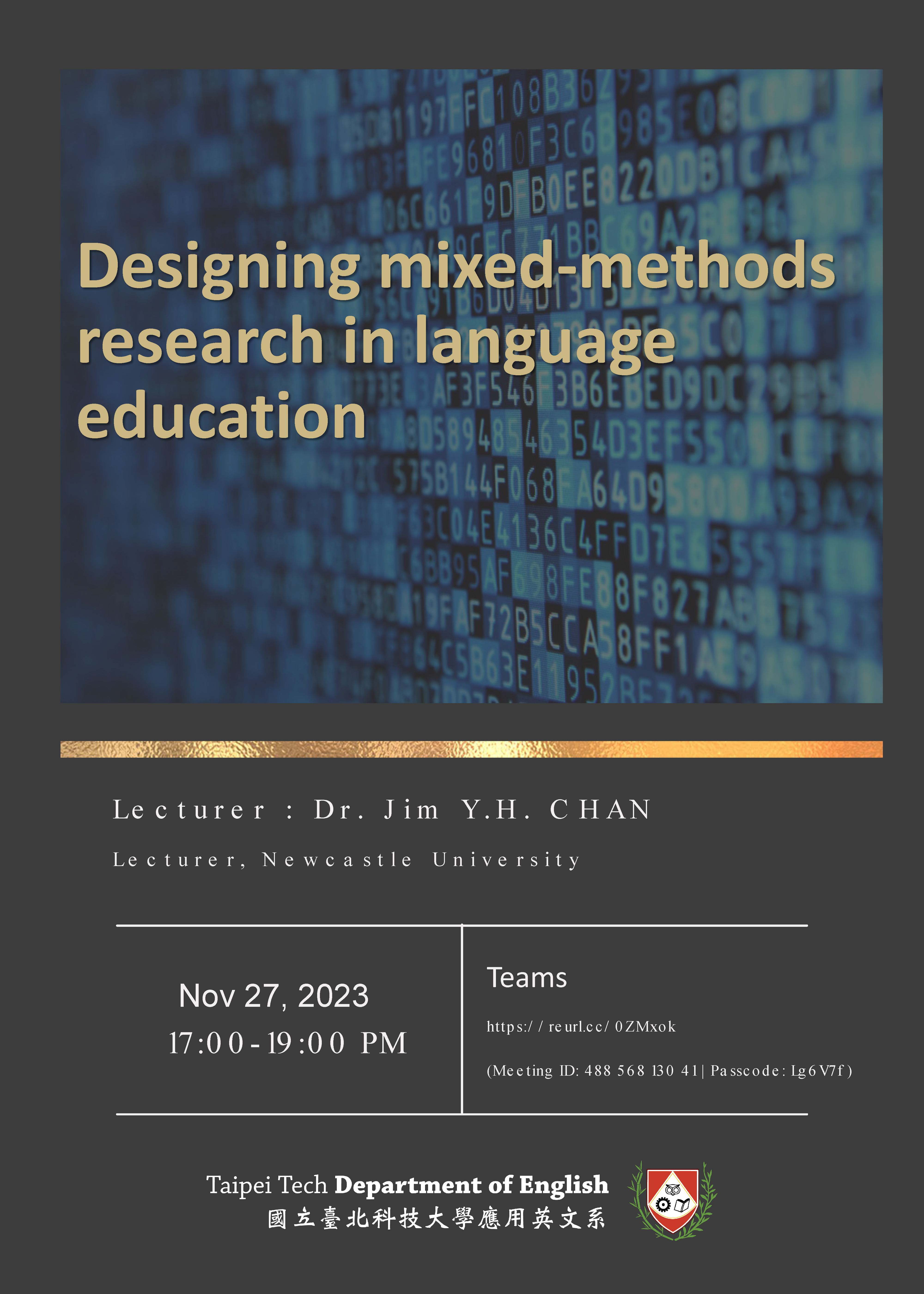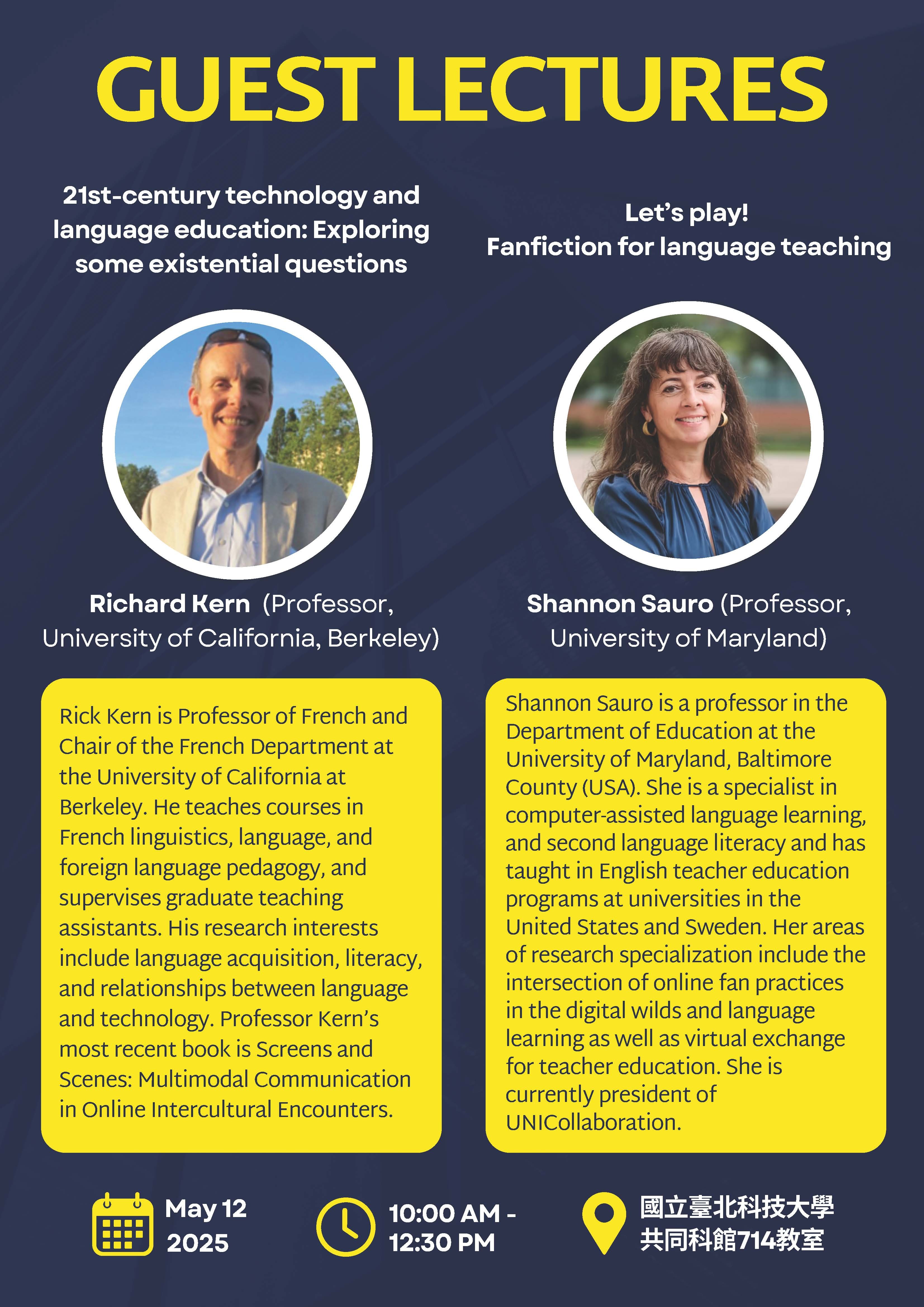- Lecturer Dr. Hung-chun Wang (王宏均), Associate Professor, Department of English, National Taiwan Normal University